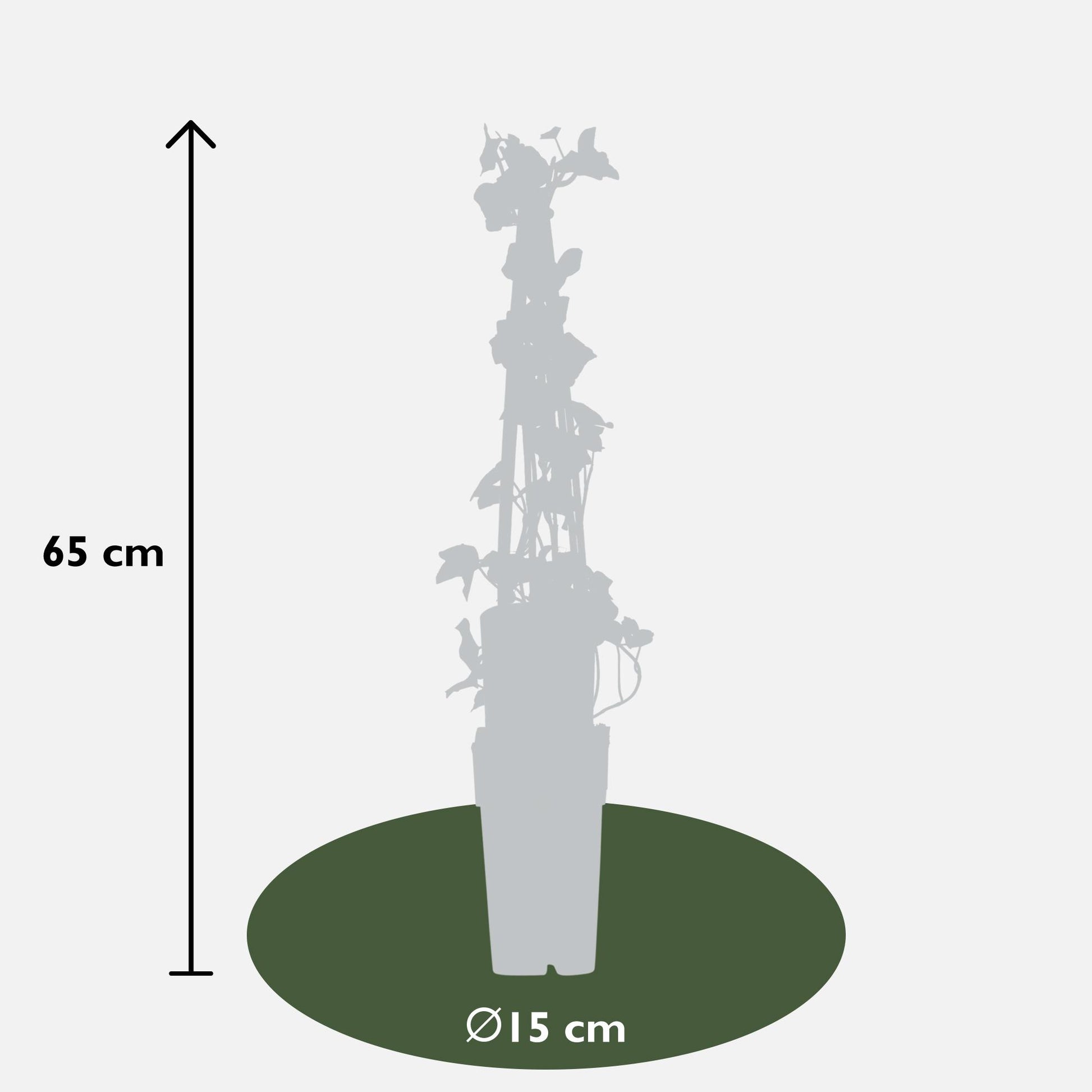 Mit einem Durchmesser von 15 cm und einer Höhe von ca. 65 cm ist diese Pflanze kompakt und vielseitig einsetzbar. Die dichten, verstreuten Blätter schaffen eine lebendige grüne Fläche, perfekt zum Verstecken von Wänden oder Zäunen.