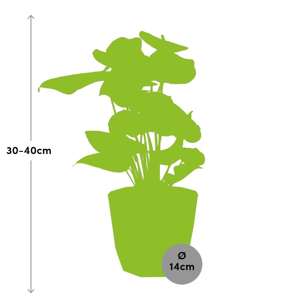 Die Pflanze wird in einem stilvollen ELHO b.for rock Topf in warm grey mit 14 cm Durchmesser geliefert. Die Anthurium selbst hat einen Topfdurchmesser von 12 cm und eine Höhe von bis zu 40 cm.