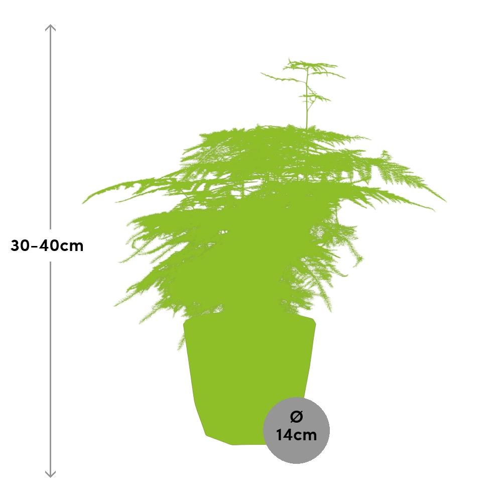 Der Spargelfarn ist eine beliebte Wahl für den Innenbereich aufgrund seines zarten und federartigen Laubs, welches jedem Raum eine Note von Eleganz und natürlicher Schönheit verleiht. Seine herabhängenden Ranken machen ihn perfekt für Hängekörbe oder zum Herunterranken von Regalen, während seine Fähigkeit, geringere Lichtbedingungen zu tolerieren, ihn zu einer vielseitigen und pflegeleichten Option für Indoor-Gartenliebhaber macht.