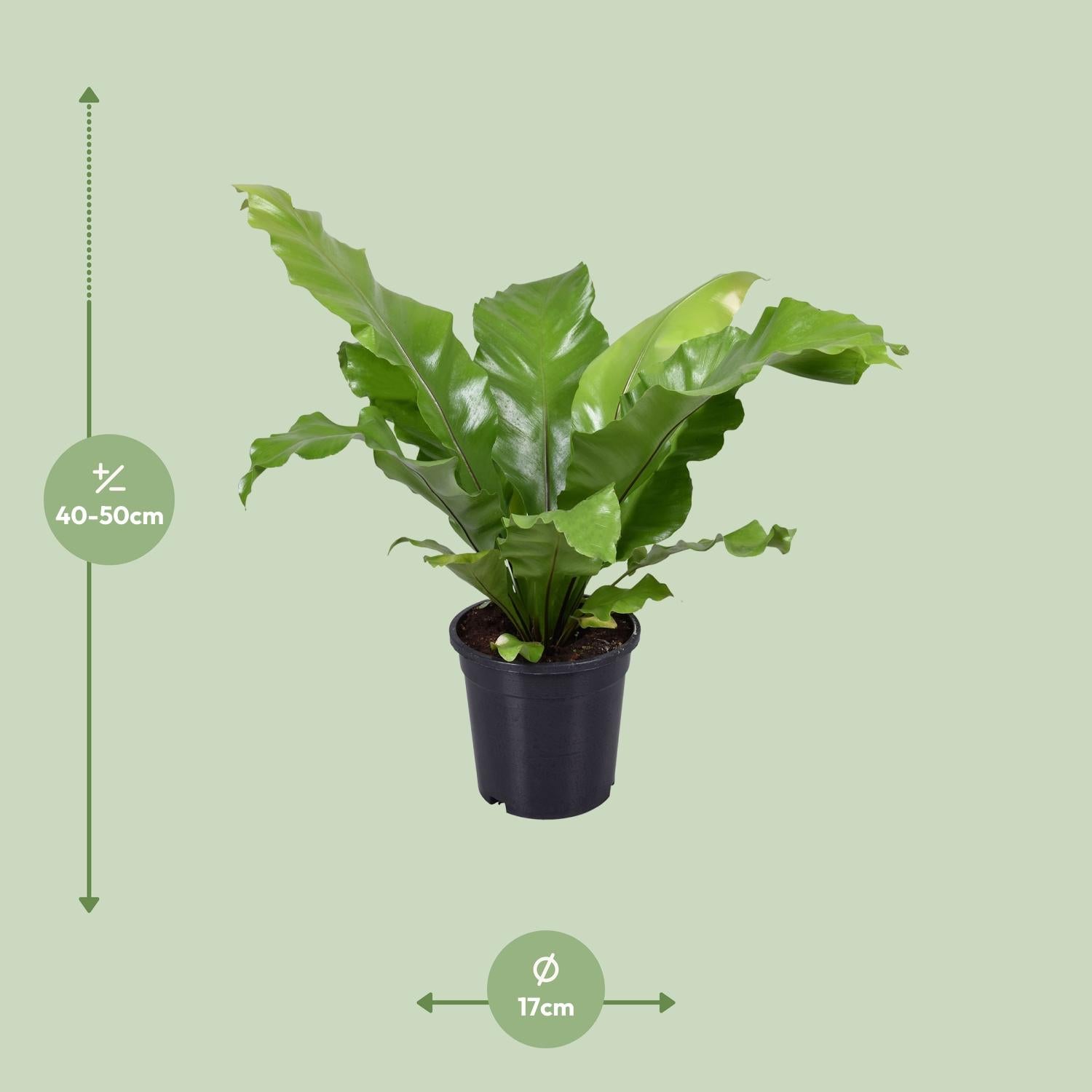 Entdecken Sie die faszinierende Schönheit von Asplenium nidus, einer beeindruckenden Zimmerpflanze, die auch als Sonnenwurz bekannt ist. Diese einzigartige Pflanze stammt aus den üppigen Regenwäldern Asiens, wo ihre lebendig grünen Wedel in lichtarmen Umgebungen prächtig gedeihen. Mit ihren breiten, welligen Blättern verleiht dieses tropische Juwel jedem Innenraum mühelos eine elegante Note. Als pflegeleichte Pflanze gedeiht Asplenium nidus bei mäßiger Luftfeuchtigkeit und regelmäßigem Gießen. Bereichern Sie Ihren Innenraumgarten mit dem lebhaften Charme von Asplenium nidus, einem bezaubernden Exemplar, das ein Stück exotischer Natur in Ihr Zuhause bringt. Vorstellen möchten wir Ihnen den exquisiten Asplenium nidus, eine atemberaubende Pflanze, die jedem Raum eine elegante Note verleiht. Diese Schönheit gedeiht in Bereichen mit Halbschatten und ist somit die perfekte Ergänzung für Ihr Zuhause oder Büro. Der Asplenium nidus muss einmal pro Woche bewässert werden, um sicherzustellen, dass seine üppig grünen Blätter lebendig und gesund bleiben. Mit minimaler Pflege und Aufmerksamkeit ist diese Pflanze eine pflegeleichte Freude. Nehmen Sie die natürliche Schönheit und Ruhe an, die dieser Asplenium nidus in Ihren Raum bringt, und erschaffen Sie mühelos eine beschauliche Oase. Erleben Sie heute die Schönheit der Natur mit dieser erstaunlichen Pflanze!Asplenium nidus, populär bekannt als der Nestfarn, ist eine atemberaubende Zimmerpflanze, die jedem Raum ein Hauch von natürlicher Schönheit verleiht! Mit ihren glänzenden Wedeln, die sich in einem einzigartigen Nestmuster entfalten, bringt dieser Farn einen besonderen Charme in die Innenraumgestaltung. Lustige Tatsache: Seine Blätter können bis zu vier Fuß lang werden und bieten eine üppige und dramatische Darstellung! Trotz seines verlockenden Aussehens solltest du bedenken, dass Asplenium nidus ausschließlich zur Dekoration gedacht ist und nicht zum Verzehr geeignet ist. Also, genieße seine faszinierende Präsenz, aber lasse dich nicht von seinem charmanten Laub zum Essen verleiten!- Asplenium nidus, allgemein bekannt als Spleenwort, ist eine einzigartige und beliebte Zimmerpflanze mit einem Topfdurchmesser von 17 cm.- Diese atemberaubende Pflanze erreicht typischerweise eine Höhe von etwa 45 cm, was sie zu einer großartigen Wahl macht, um jedem Raum etwas Grün zu verleihen.- Asplenium nidus ist auch als Spleenwort bekannt, ein Name, der von ihren einst geglaubten medizinischen Eigenschaften in Bezug auf Milzleiden abgeleitet ist.- Diese Pflanze gedeiht in teilweise schattigen Bereichen.- Fun Fact: Asplenium nidus wird aufgrund ihrer charakteristischen kreisförmigen Anordnung von Wedeln, die einem Vogelnest ähnelt, häufig als "Vogelnestfarn" bezeichnet.