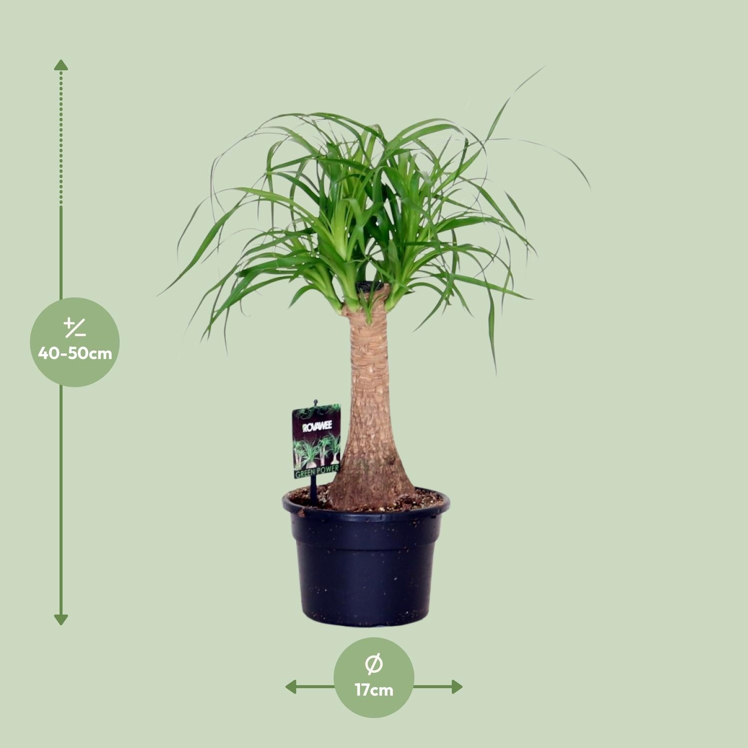 Die Beaucarnea wird in einer Größe von 17 cm geliefert, ideal für einfache Transport und Handhabung.Die aktuelle Höhe dieser Beaucarnea beträgt ungefähr 50 cm, eine großartige Ergänzung für jeden Innenraum.Beaucarnea gedeiht an einem Ort mit halbem Schatten und ist daher eine ideale Wahl für diejenigen, die nach einer Pflanze für schwaches Licht suchen.Die Pflege von Beaucarnea ist äußerst einfach, wodurch sie eine ausgezeichnete Wahl für Anfänger oder vielbeschäftigte Personen ist.Mit ihrem einzigartigen Erscheinungsbild verleiht die Beaucarnea-Pflanze jedem Raum eine exotische Schönheit und Eleganz.