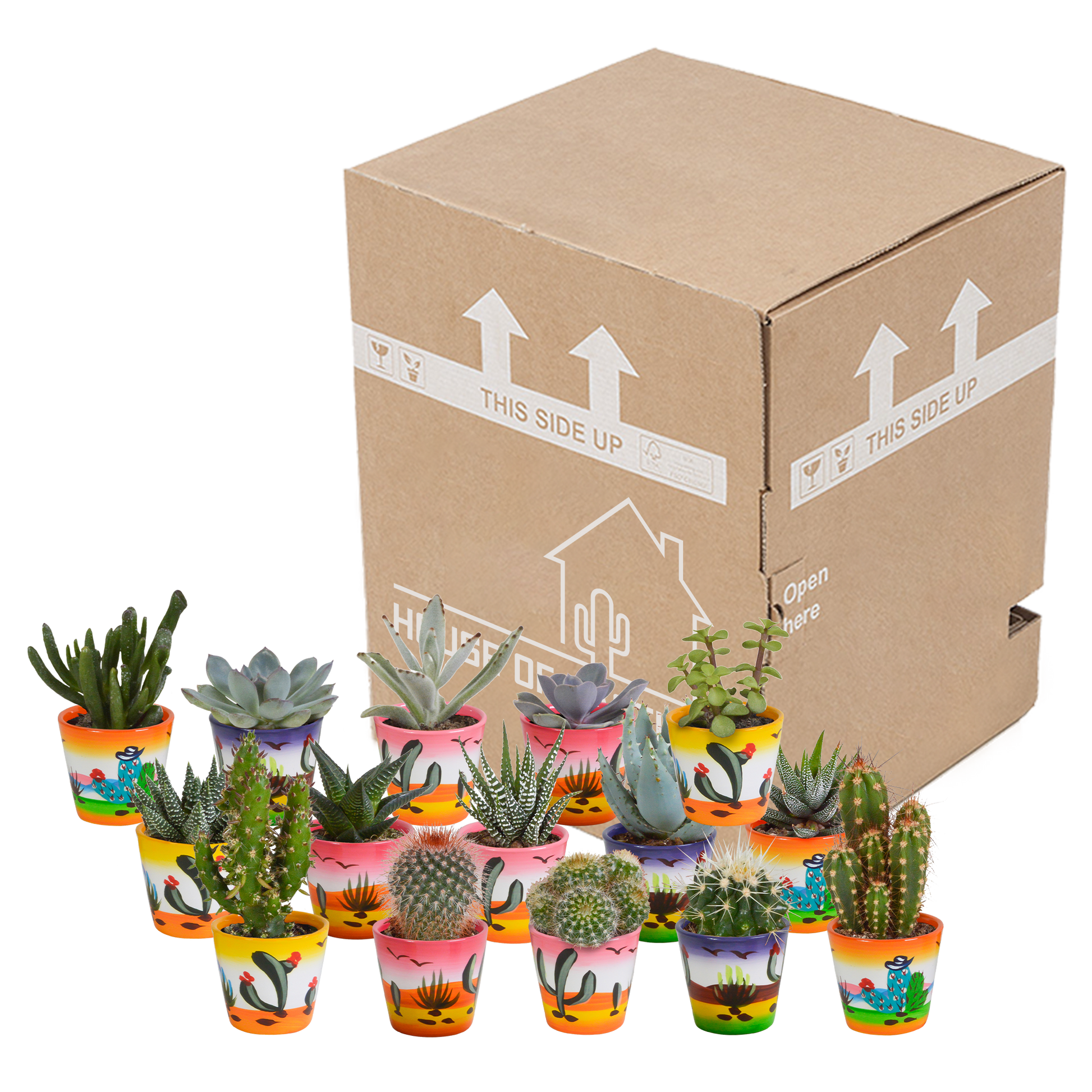 Was für eine MEGA-Mischung ist das! Diese Mischung besteht aus nicht weniger als 15 Kakteen und Sukkulenten, die sich in Farbe, Höhe und Form unterscheiden. Von Cereus bis Echeveria und von Haworthia bis Crassula ist alles in dieser Mischung enthalten. Alle Pflanzen in dieser Mischung stammen direkt vom Züchter und sind daher von höchster Qualität. Diese Mischung wird in einem handbemalten mexikanischen Glas geliefert.