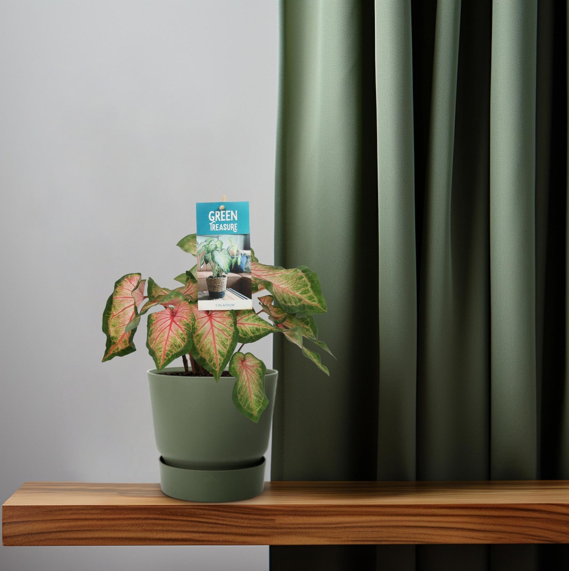Engel Flügel ist eine Zimmerpflanze, die für ihr auffälliges Laub bekannt ist. Mit ihren herzförmigen Blättern, die deutliche Adernmuster haben, verleiht sie jedem Raum einen Hauch von Eleganz und Schönheit. Diese beliebte Zierpflanze gehört zur Gattung Caladium und stammt aus den tropischen Regionen Südamerikas, insbesondere aus Brasilien. Die Caladium wächst ursprünglich in Gebieten mit warmem und feuchtem Klima, was sie zu einer idealen Wahl für den Innenanbau macht. Sie gedeiht in gut durchlässigem Boden und benötigt konstante Feuchtigkeit, um ein Austrocknen ihrer empfindlichen Blätter zu verhindern. Engel Flügel werden in der Regel wegen ihres Laubs und nicht wegen ihrer Blüten angebaut, da ihre bunten Blätter in verschiedenen Farbtönen wie Grün, Pink und Rot kommen. Sie sind auch für ihre luftreinigenden Eigenschaften bekannt, was sie zu einer perfekten Ergänzung für jede Innenumgebung macht. Caladiums, auch bekannt als Engelsglück, gedeihen an einem Ort, der teilweisen Schatten oder Sonne erhält. Sie benötigen einmal pro Woche Bewässerung, um den Boden feucht zu halten. Um ein gesundes Wachstum zu gewährleisten, pflanzen Sie sie in eine gut durchlässige Erde mit reichlich organischer Substanz. Eine monatliche Düngung mit einem ausgewogenen Dünger während der Wachstumszeit sorgt für die notwendigen Nährstoffe. Achten Sie jedoch darauf, nicht zu viel zu düngen, da dies das zarte Laub schädigen kann. Mit diesen Pflegetipps werden Ihre Caladiums das ganze Jahr über ihre lebendigen und auffälligen Blätter zeigen. Engelsflügel werden häufig drinnen als Zierpflanzen verwendet und verleihen jedem Raum eine Note von Eleganz und Ruhe. Mit ihren großen, markanten Blättern, die Engelsflügeln ähneln, werden diese Pflanzen oft in Wohnzimmern, Büros und sogar Schlafzimmern platziert, um eine beruhigende und friedliche Atmosphäre zu schaffen. 1. Engel Flügel werden in einer kompakten Größe geliefert, die etwa 12 cm hoch misst. 2. Derzeit erreicht die Engel Flügel Pflanze eine beeindruckende Höhe von etwa 35 cm und zeigt ihr Wachstumspotenzial. 3. Diese vielseitige Pflanze bevorzugt einen Platz im Halbschatten, wodurch sie optimal für Innenräume mit mäßiger Sonnenlichtexposition geeignet ist. 4. Die Pflege der Engel Flügel ist ein Kinderspiel, da sie nur minimaler Wartung und Aufmerksamkeit bedarf, perfekt für beschäftigte Pflanzenliebhaber. 5. Mit ihrem auffälligen Erscheinungsbild zeichnen sich Engel Flügel durch kunstvoll strukturierte Blätter aus, die die ätherische Schönheit von Engelsflügeln widerspiegeln.