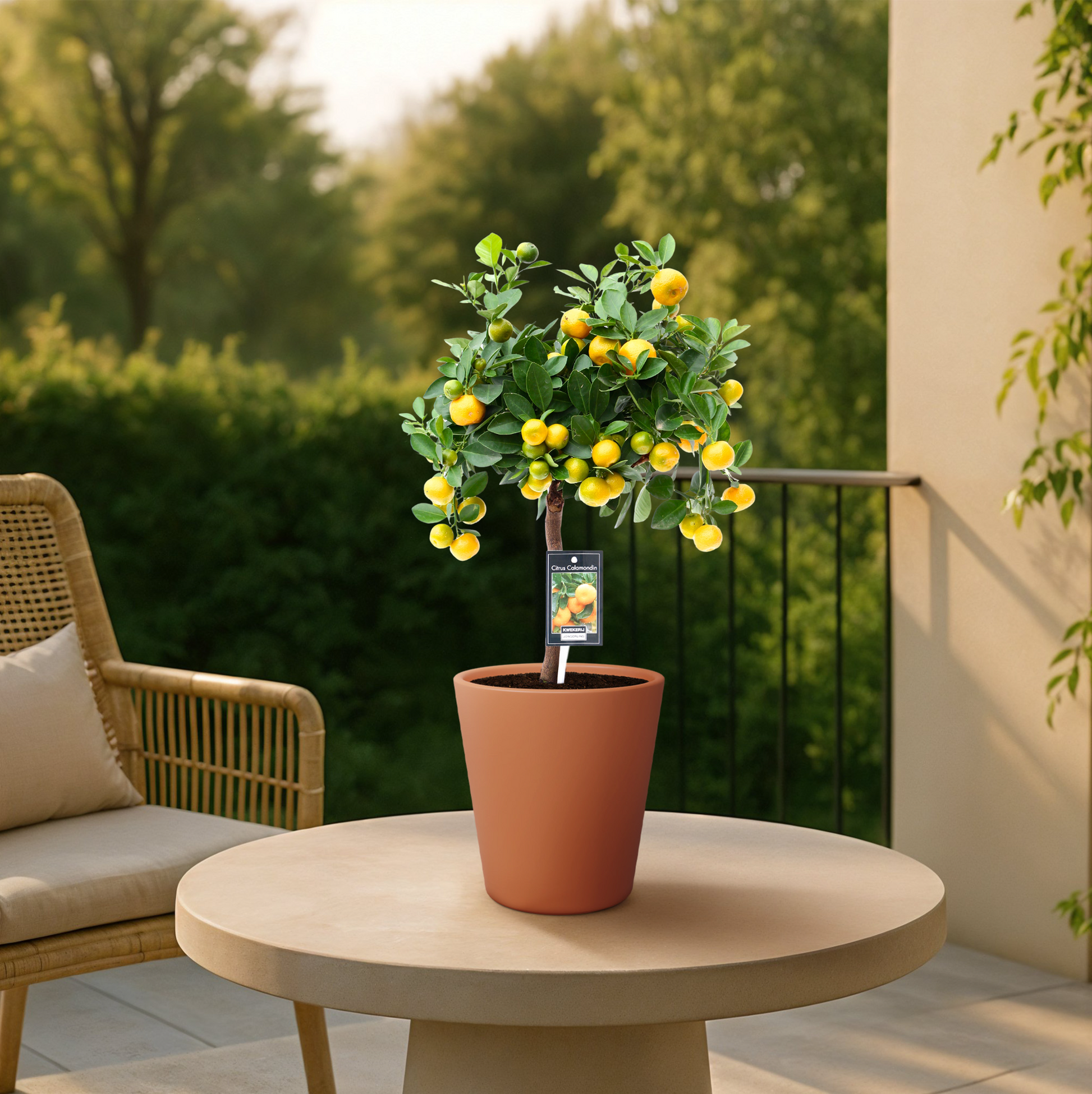 - Die Citrus Calamondin ist eine kompakte Zitruspflanze mit glänzenden, dunkelgrünen Blättern.