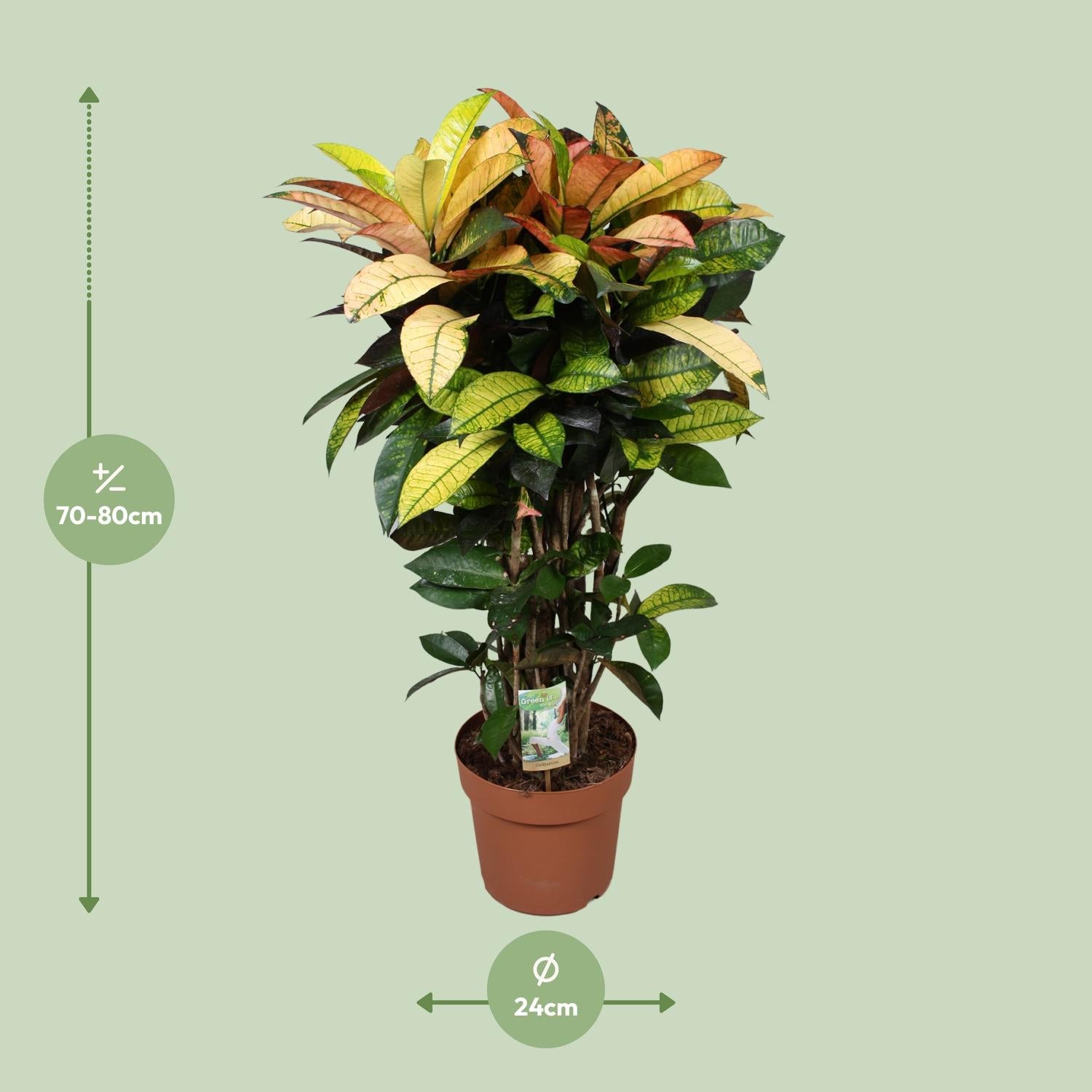 Dieser Croton wird in einer Größe von 24 cm geliefert und ist daher perfekt für Innenräume geeignet.Mit einer aktuellen Höhe von etwa 80 cm wird dieser Croton sicherlich zu einem Blickfang in jedem Raum.Finden Sie den idealen Platz für diese Pflanze in Ihrem Zuhause - sie gedeiht im Halbschatten und ist daher leicht an einen perfekten Wachstumsort anzupassen.Die Pflege des Crotons ist ein Kinderspiel - seine robuste Natur macht ihn zu einer pflegeleichten Wahl für jeden Pflanzenliebhaber.Dieser Croton ist nicht nur eine schöne Ergänzung für jeden Raum, sondern verfügt auch über lebendige und buntgemusterte Blätter, die Ihrer Dekoration einen Farbtupfer verleihen.
