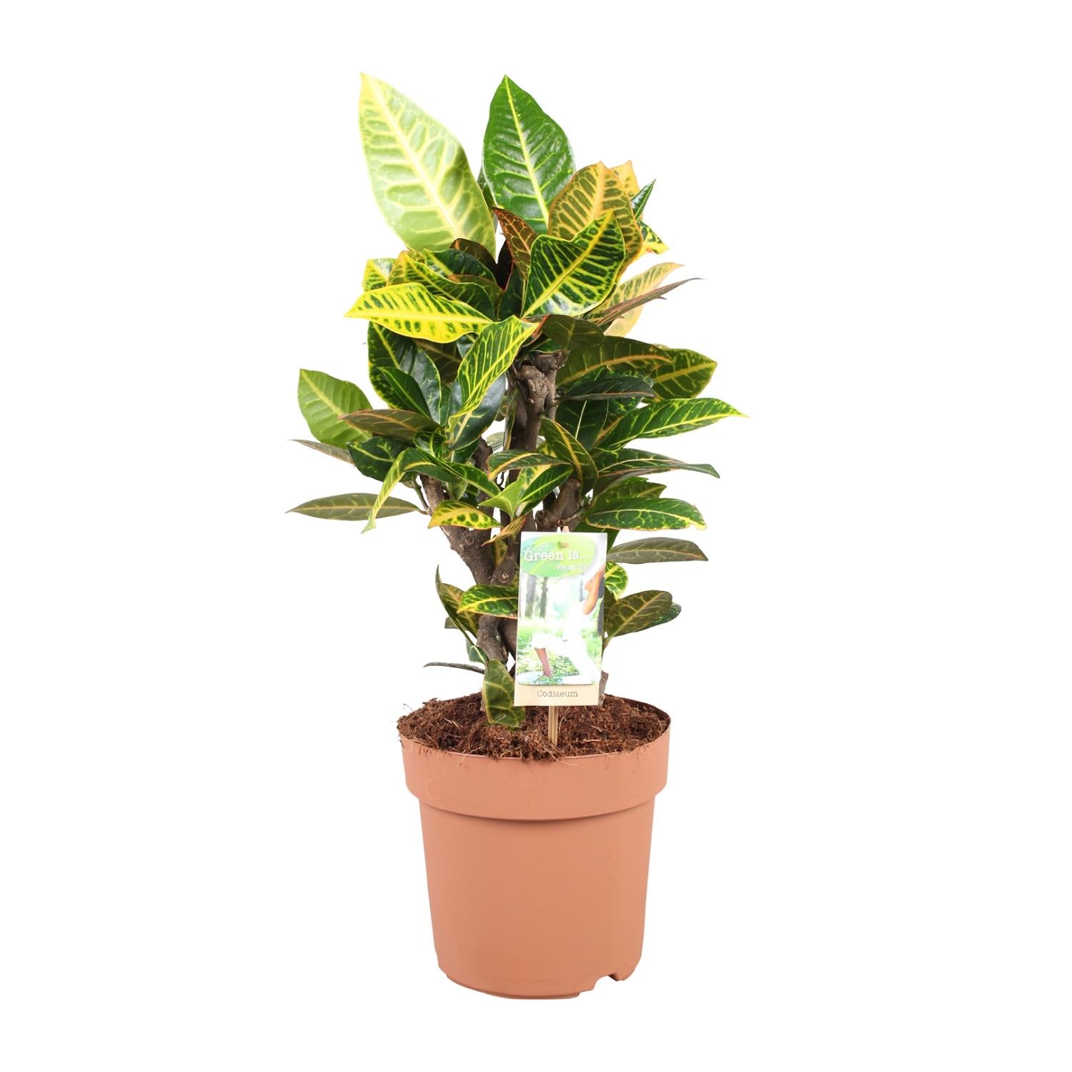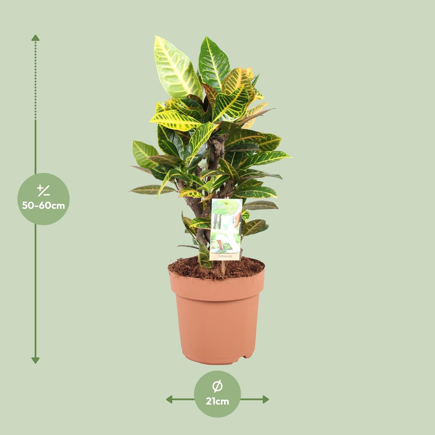 - Croton ist eine atemberaubende Zierpflanze, geliefert in einem 21 cm Topf, perfekt, um jedem Raum Farbe zu verleihen.- Mit einer aktuellen Höhe von etwa 60 cm ist dieser Croton bereit, in Ihrem Zuhause oder Garten ein Statement abzugeben.- Diese Pflanze gedeiht an einem Ort mit halbschattiger Lage und eignet sich daher ideal, um Bereichen mit begrenztem Sonnenlicht Lebendigkeit zu verleihen.- Die Pflege des Croton ist ein Kinderspiel, da er nur minimale Wartung erfordert und für seine Haltbarkeit bekannt ist.- Mit seinem auffälligen und gemusterten Laub verleiht der Croton jedem Ambiente einen Hauch tropischer Schönheit und ist somit eine perfekte Wahl für Pflanzenenthusiasten.