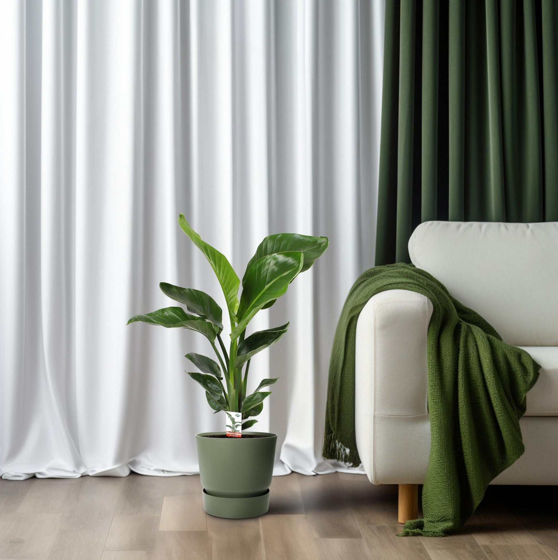 Die Strelitzia Nicolai, auch bekannt als Paradiesvogelblume, bringt tropische Eleganz in jeden Raum. Mit ihren markanten, lebhaften orange-blauen Blüten und den großen, grünen Blättern ist sie ein echter Blickfang, der gleichzeitig das Raumklima verbessert.